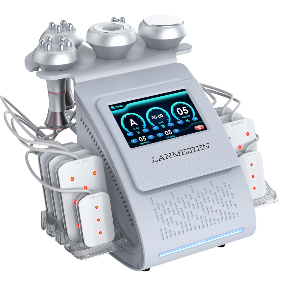 LANMEIREN 6 in 1 laser 80K cavitation machine with 1 Tripolar RF head,1 Quadrupole RF head, 1 Hexapole RF head, one 80K head, 1 vacuum head and 8 laser pads.