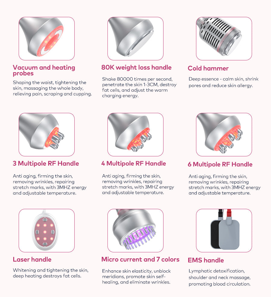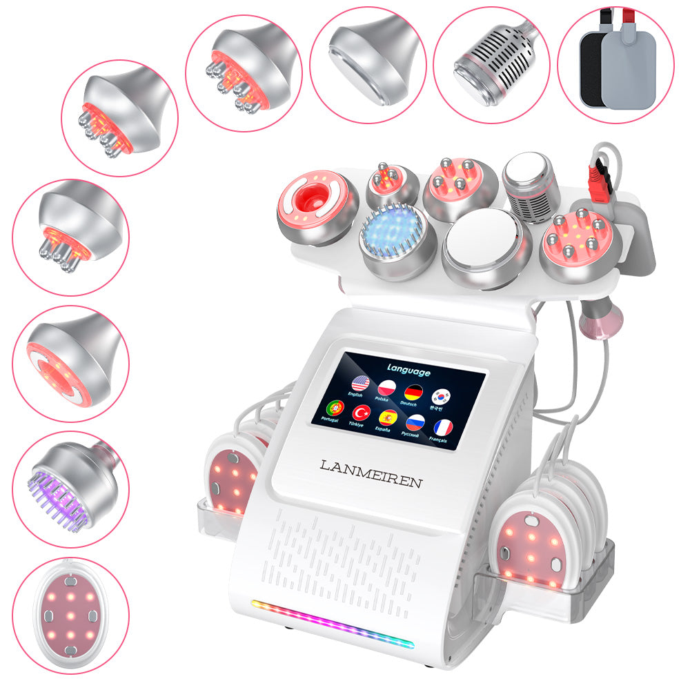 LANMEIREN 9 in 1 laser 80K cavitation machine with 1 Tripolar RF head,1 Quadrupole RF head, 1 Hexapole RF head, one 80K head, 1 vacuum head, 2 EMS plates, 1 Ice Hammer, 1 Micro brush and 6 EMS laser pads.