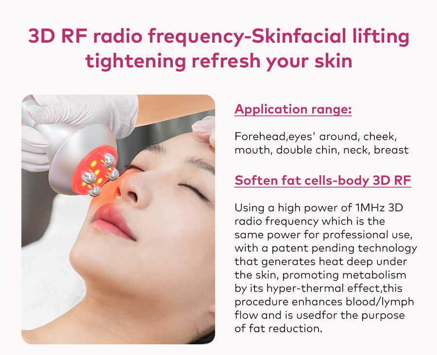 It can dissolve fat, detoxify lymph, tighten skin, enhance skin elasticity, reach fat layer directly, have the function of directional RF output, accelerate the movement of fat cells to generate heat energy, and discharge the excess fat and toxin in the face out of the body through sweat glands, liver intestine circulation and lymph circulation, so as to dissolve fat.